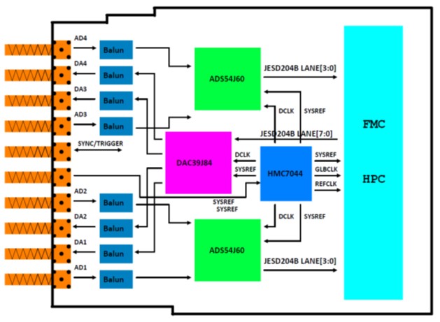 FMC164子卡集成4通道1Gsps采样率,16位AD,4通道1.25Gsps 16位DA。板载时钟芯片HMC7044,可以提供JESD204B所需要的各种时钟。具有同步/触发功能,模拟信号采用SSMC射频连接器输入和输出。板卡可广泛应用于通信多载波,雷达与智能天线,测试与测量,软件无线电等。