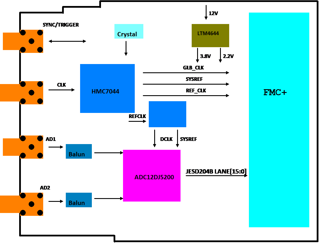 FMC200子卡集成双通道5.2Gsps采样率或单通道10.4Gsps采样率AD。板载时钟芯片HMC7044和LMX2594,可以提供JESD204C所需要的各种时钟。具有同步/触发功能,模拟信号采用SSMA射频连接器输入和输出。标准FMC+子卡,符合VITA57.4规范。板卡可广泛应用于通信,雷达,仪表和自动测试设备,工业自动化等领域。