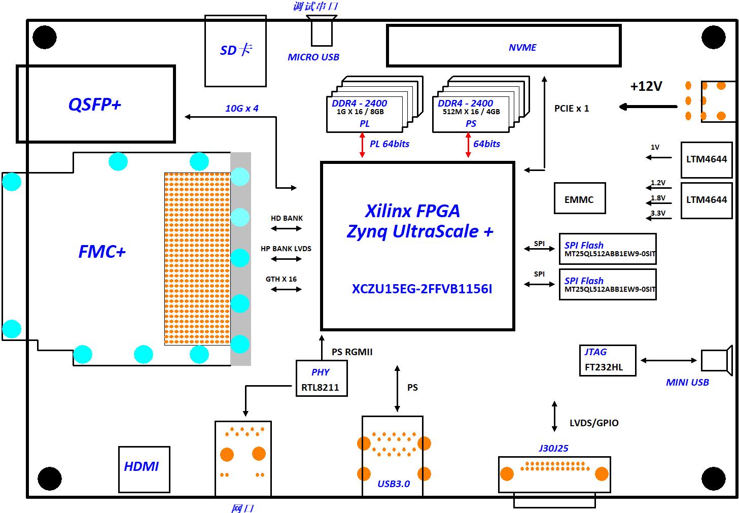 ZU902是一款基于XILINX Zynq UltraScale+ MPSoCs系列,芯片型号为ZU15EG-2FFVB1156的一款高性能FMC+载板。该芯片将四核ARM Cortex-A53和FPGA可编程逻辑集成在一颗芯片上。该板卡为用户提供了丰富的外设接口。