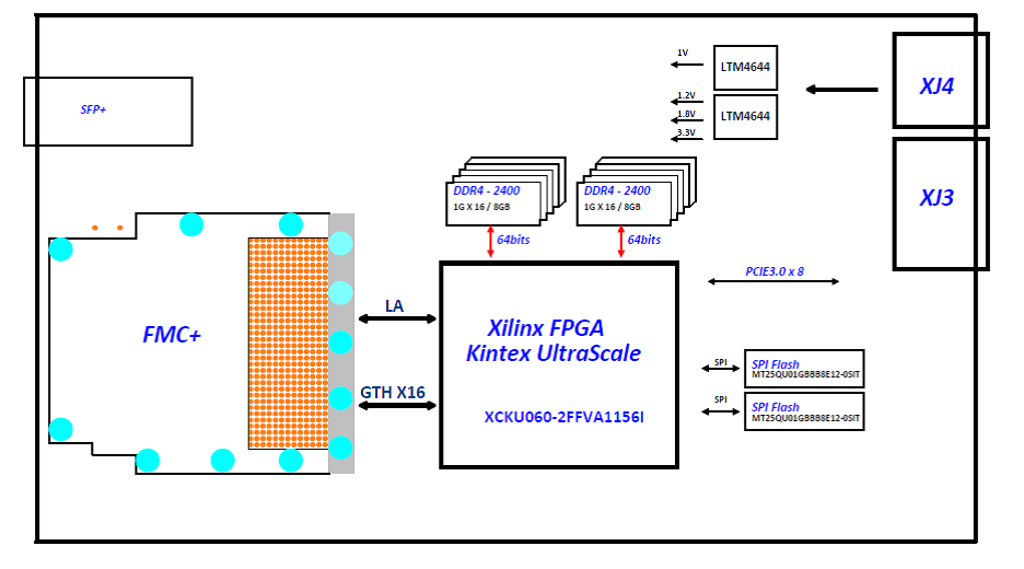 ☆FMC+(FMC)接口:FMC+(HPC)接口,符合VITA57.4规范,SERDES线速率可达15Gsps。