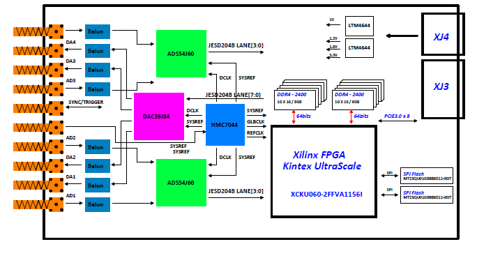 PXIE9164集成4通道1Gsps采样率,16位AD,4通道1.25Gsps 16位DA。板载时钟芯片HMC7044,可以提供JESD204B所需要的各种时钟。具有同步/触发功能,模拟信号采用SSMC射频连接器输入和输出。