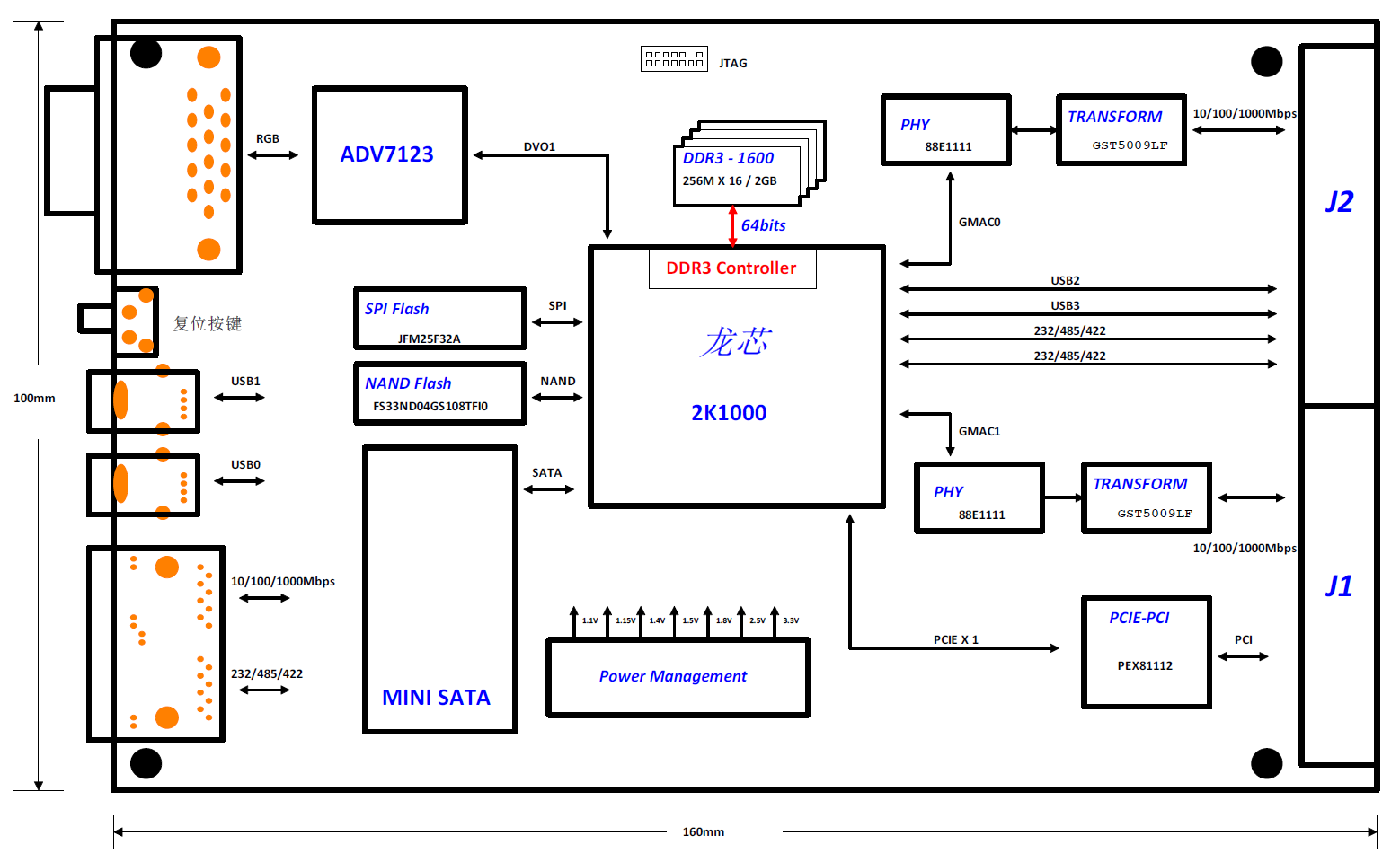 2个10/100/1000BASE-T以太网接口分别J1和J2引出;