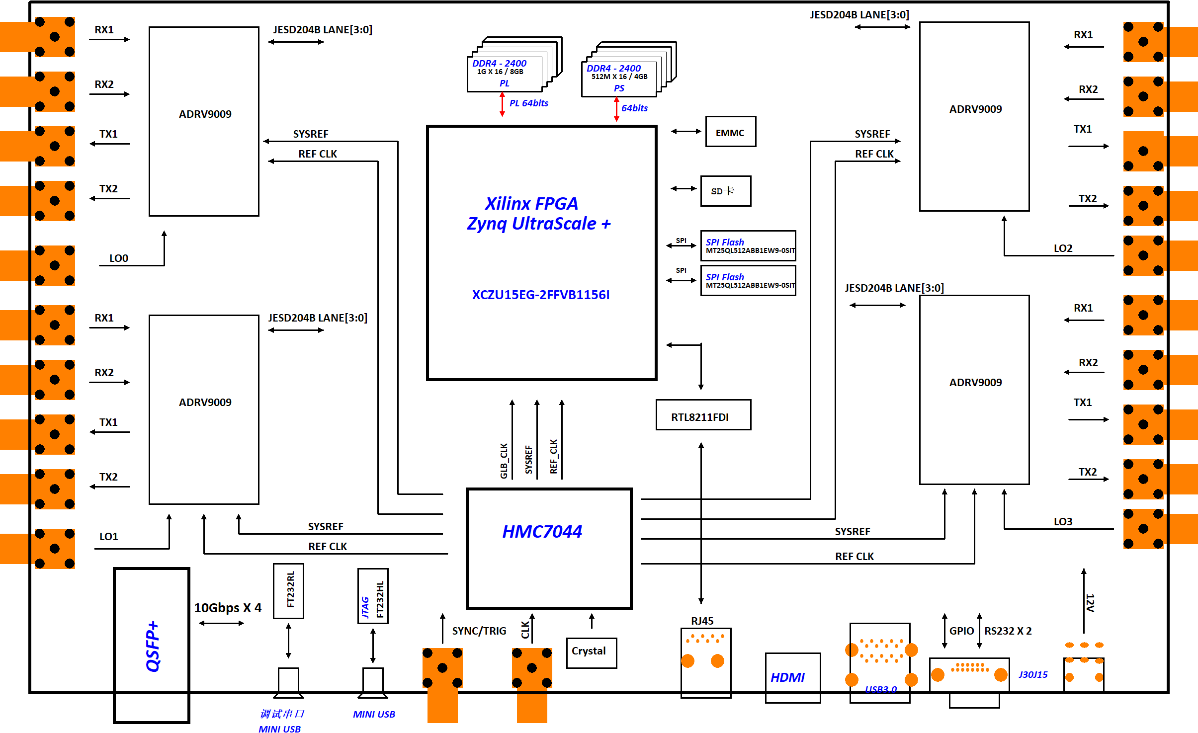 ZU909是一款基于XILINX Zynq UltraScale+ MPSoCs系列,FPGA芯片型号为ZU15EG-2FFVB1156,集成4片ADRV9009的软件无线电验证平台。实现8发8收,支持多通道同步,200MHz带宽,75MHz-6GHz,提供一个千兆网口,一个HDMI显示接口,一个USB3.0接口,一个SD卡接口,一个40G光口。